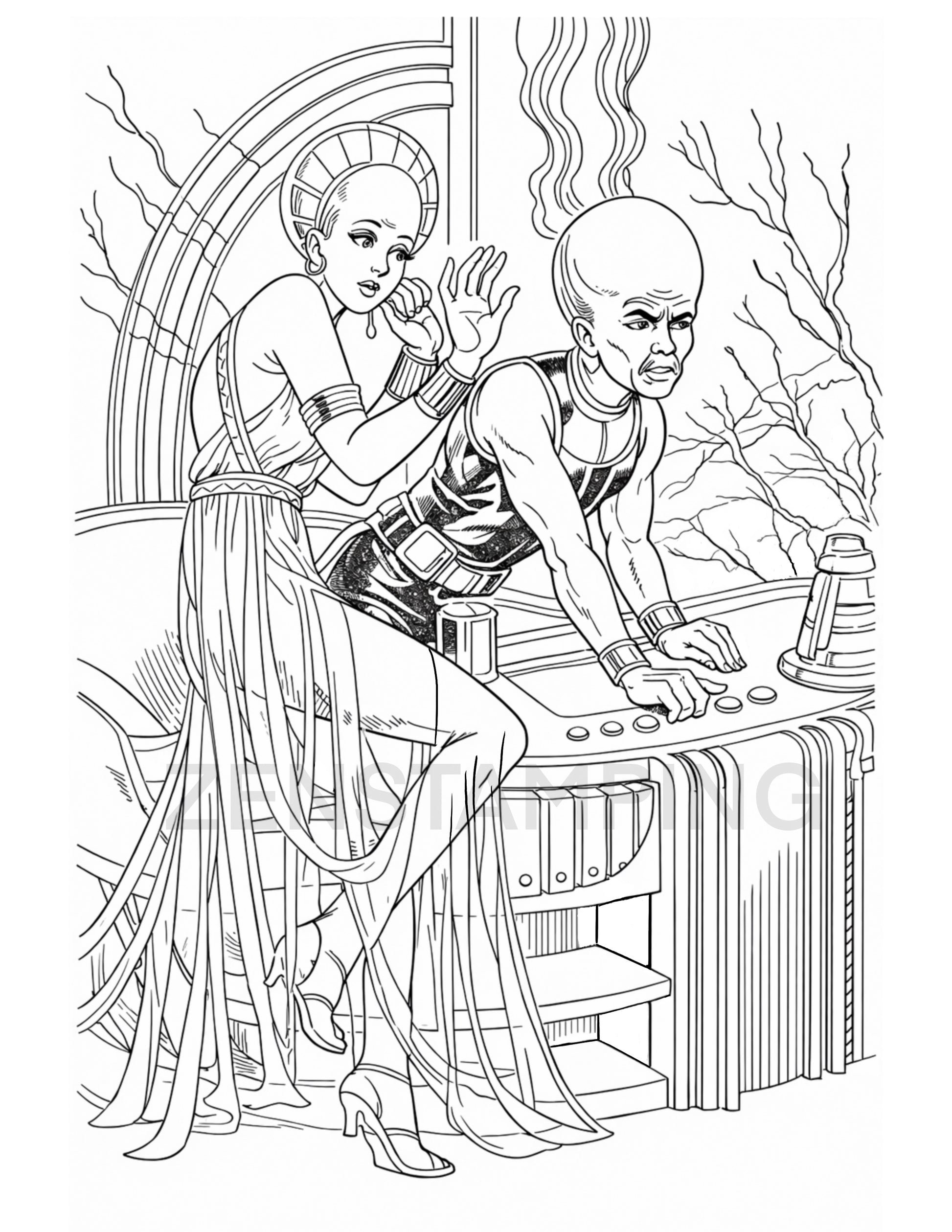12 Printable Retro Sci-Fi Coloring Pages (PDF .zip)