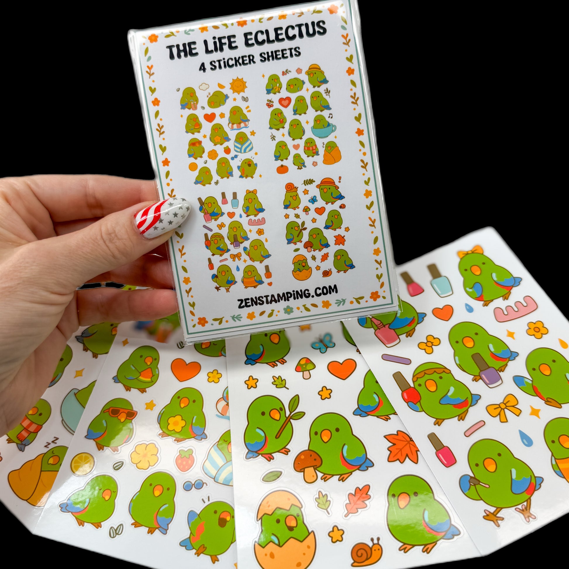 Celebrate the colorful moods and mischief of Sam the eclectus with this four-sheet sticker pack and button set! From beach naps to fall adventures, spa days to snack time, each sheet captures a playful slice of parrot life.